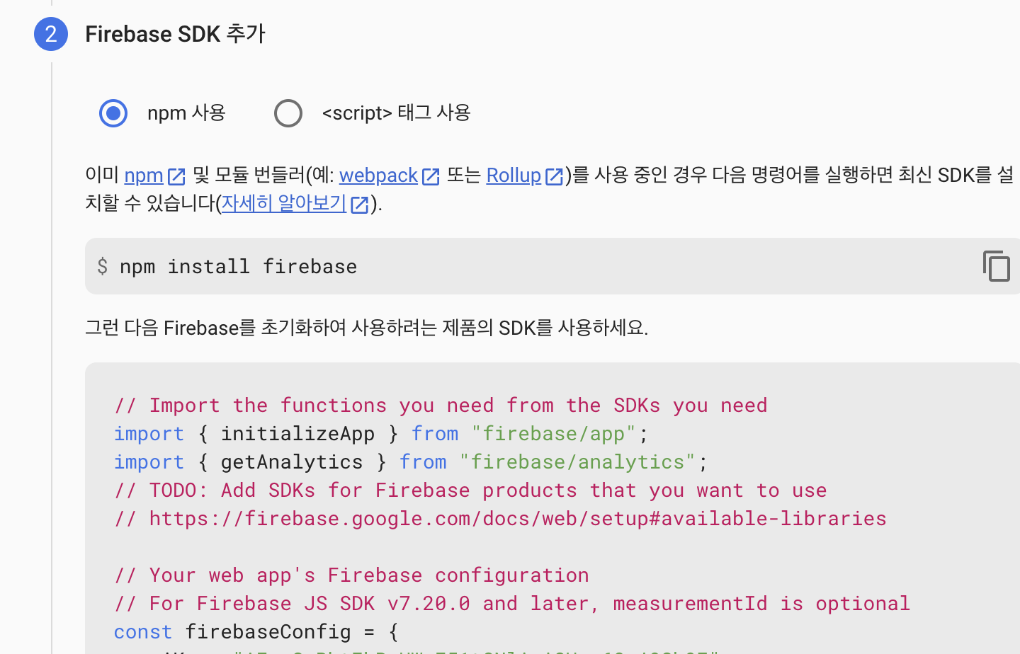 나오는 sdk추가 코드의 const firebaseConfig 함수를 복사한 후 firebase.prod.js 코드의 config 함수에 붙여넣는다