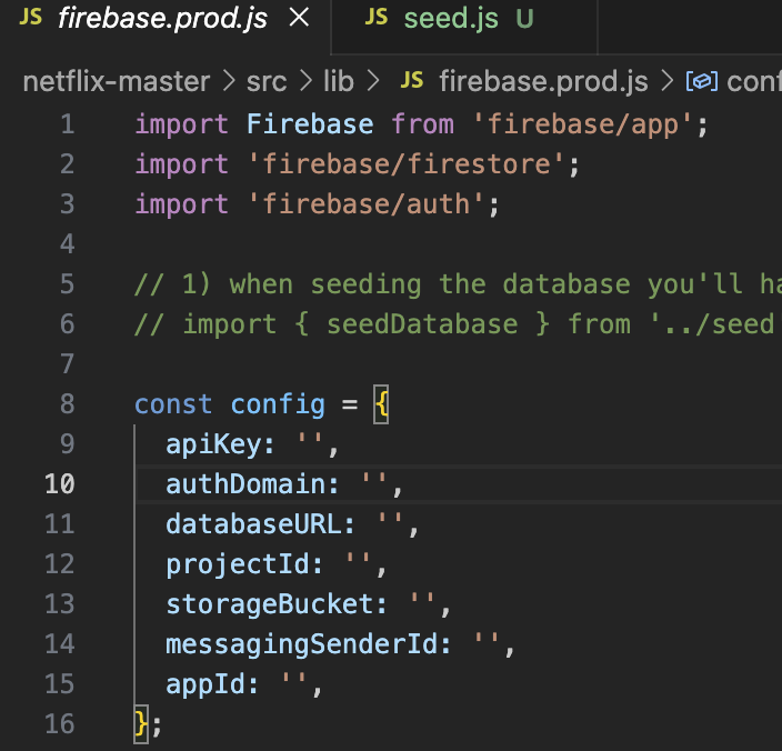 ## const firebase = initializeApp(config); 아래 seedDatabase 주석