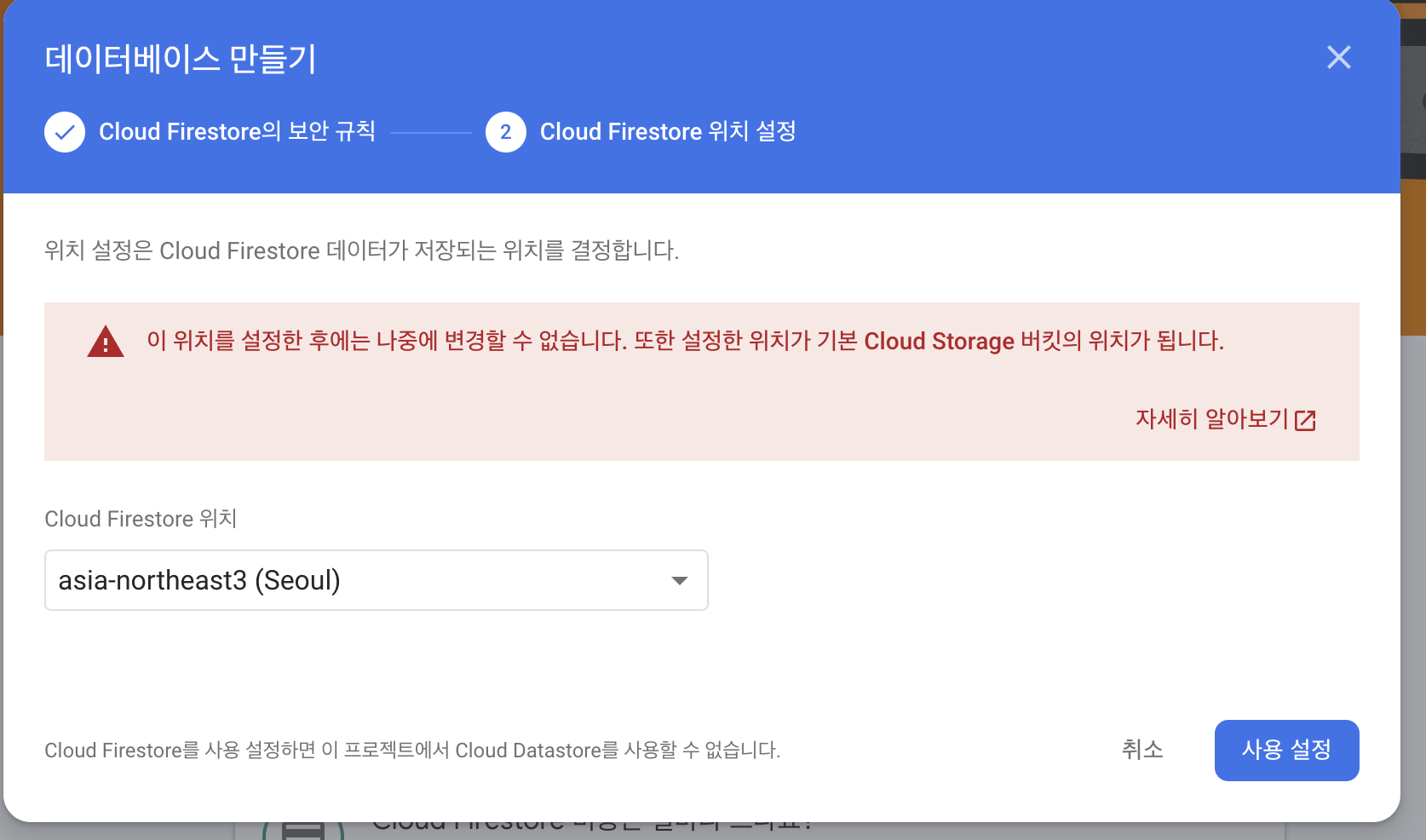 상황에 맞게 일반 혹은 테스트를 선택 후 Cloud Firestore 위치는 서울로 지정하였다.
