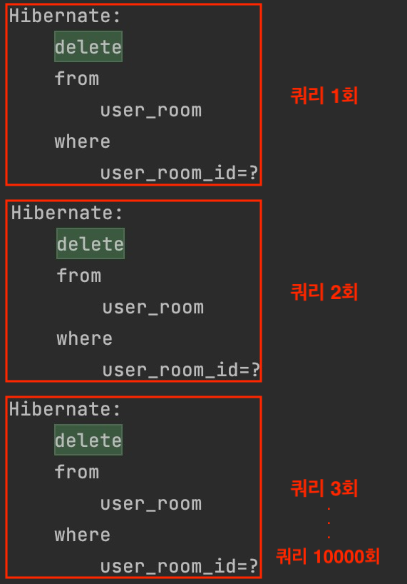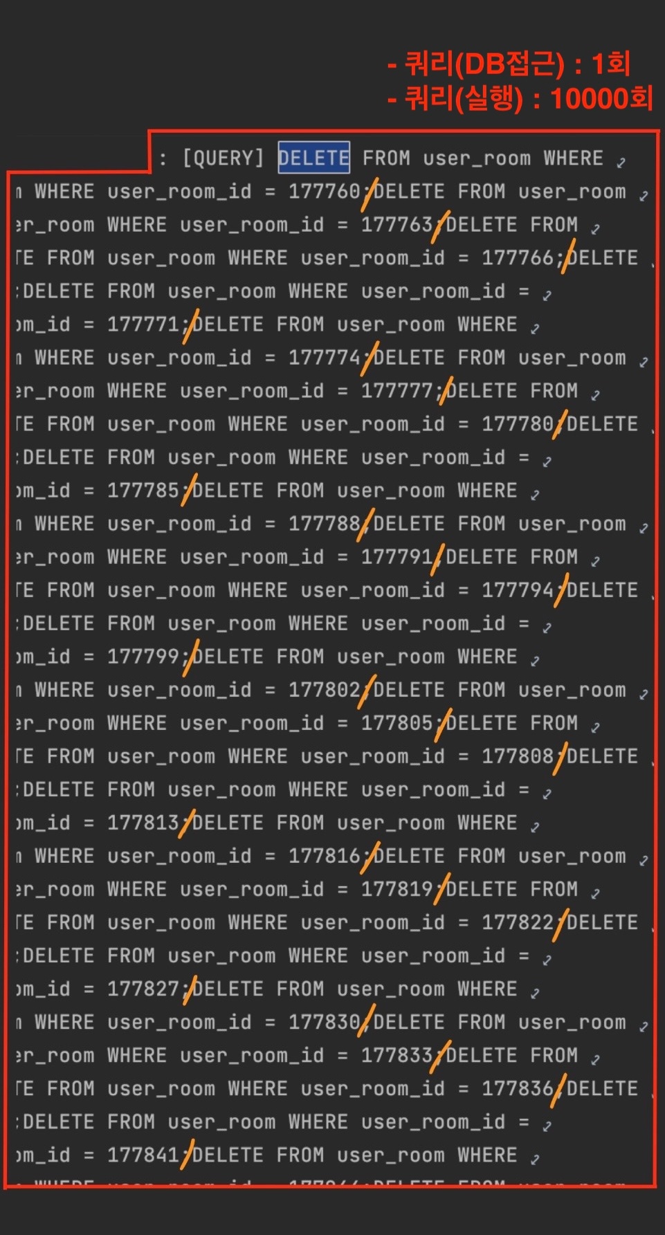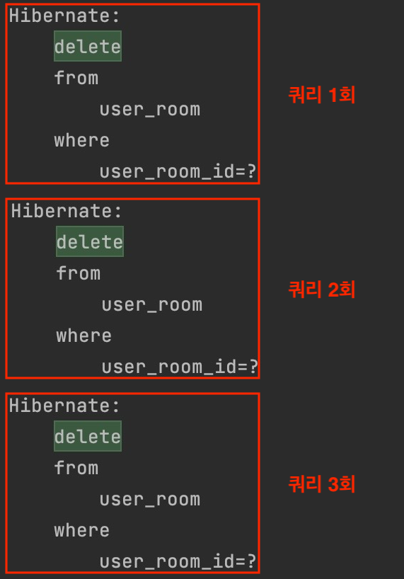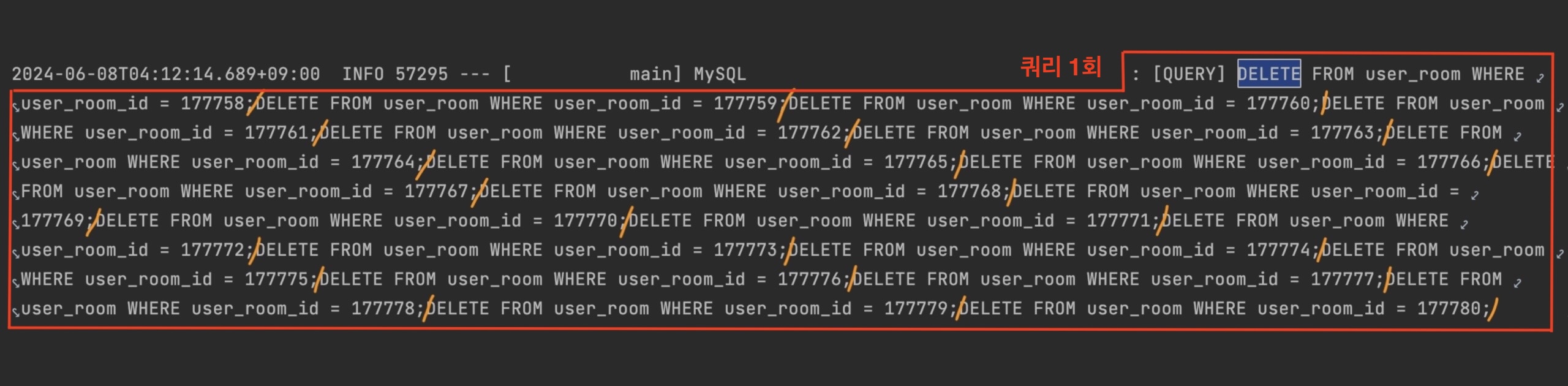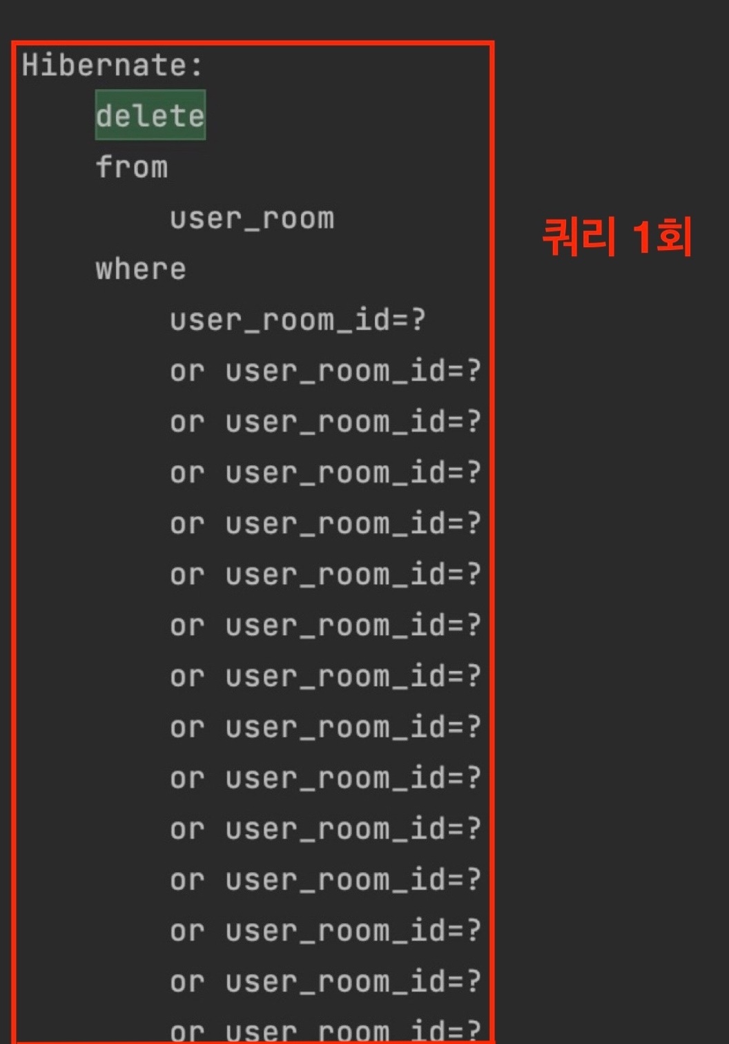 이 때문에 deleteAll(List<UserRoom>) 사용 시, UserRoom 엔티티마다 개별 쿼리가 발생하게 되고, 결과적으로 Bulk 방식으로 처리되지 않는 문제가 발생한 것이다.