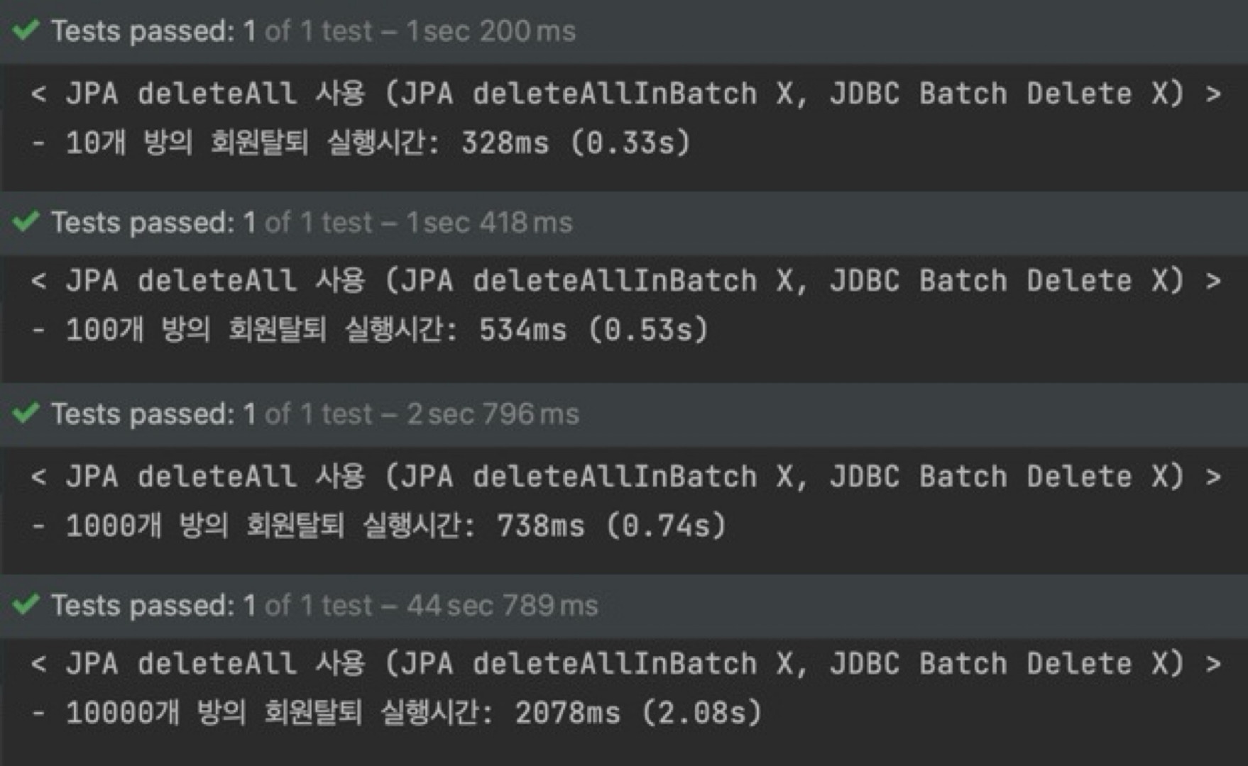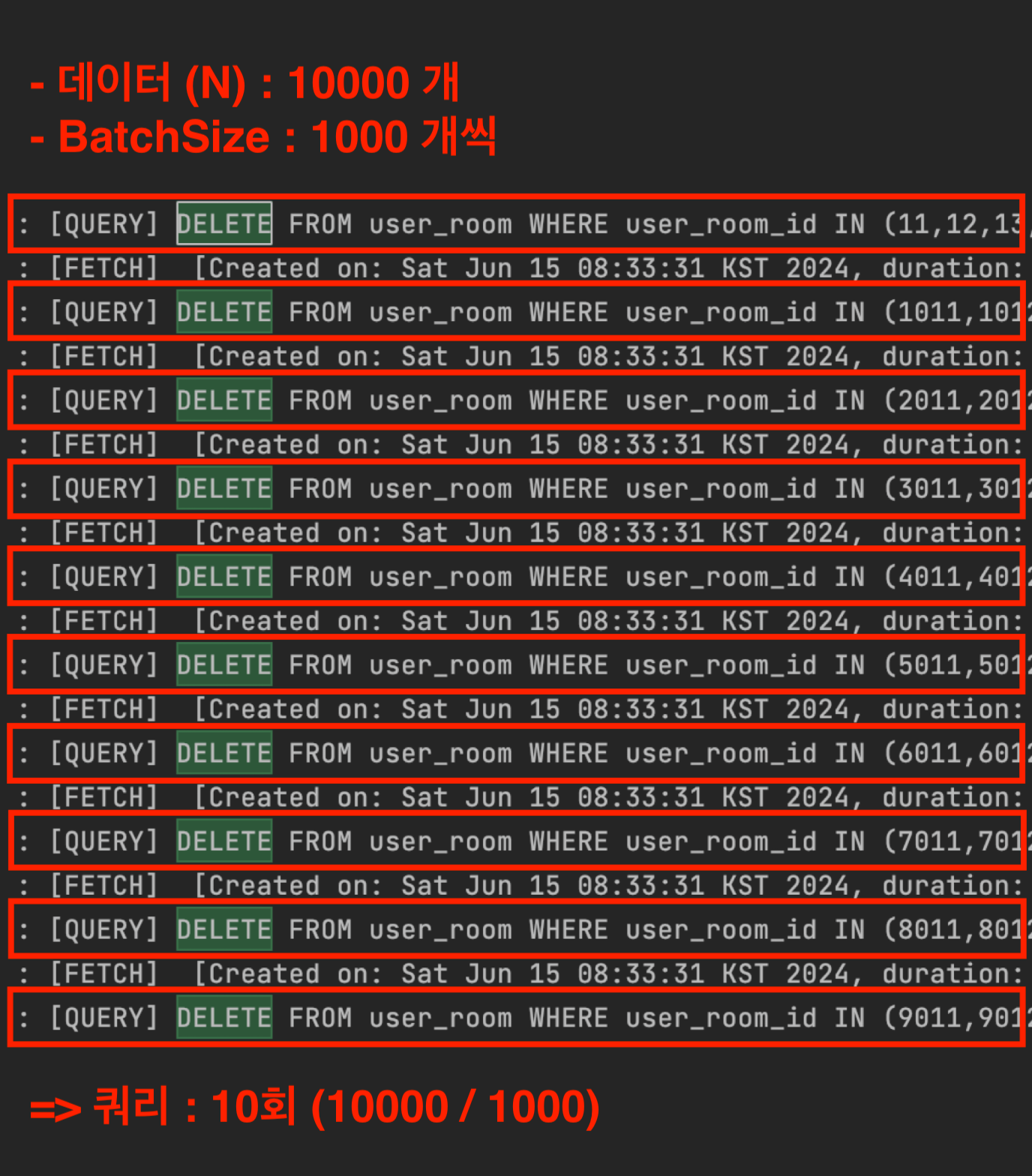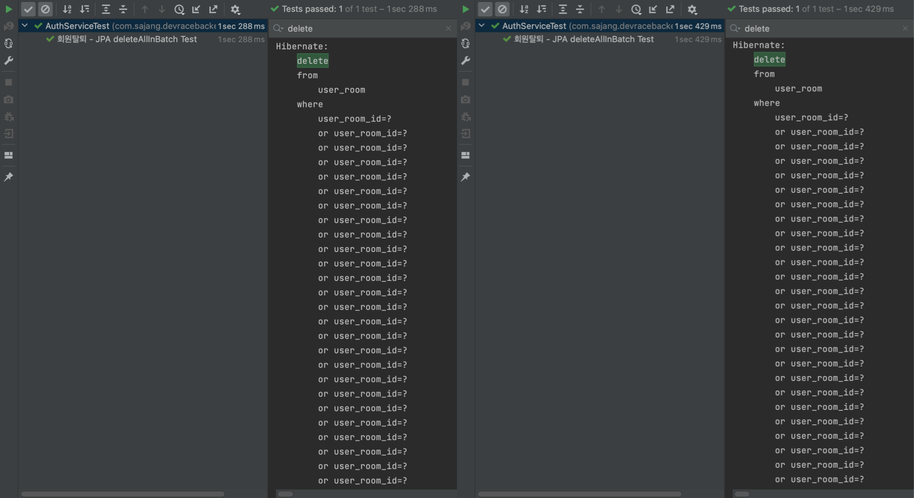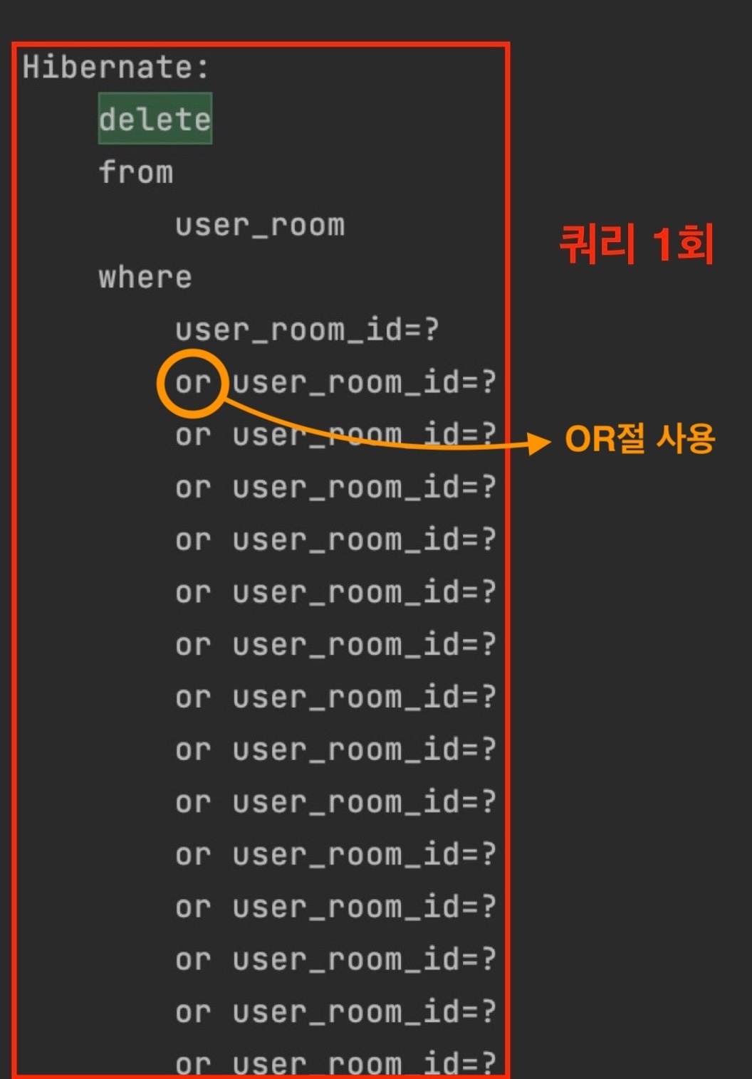 이 때문에 deleteAll(List<UserRoom>) 사용 시, UserRoom 엔티티마다 개별 쿼리가 발생하게 되고, 결과적으로 Bulk 방식으로 처리되지 않는 문제가 발생한 것이다.