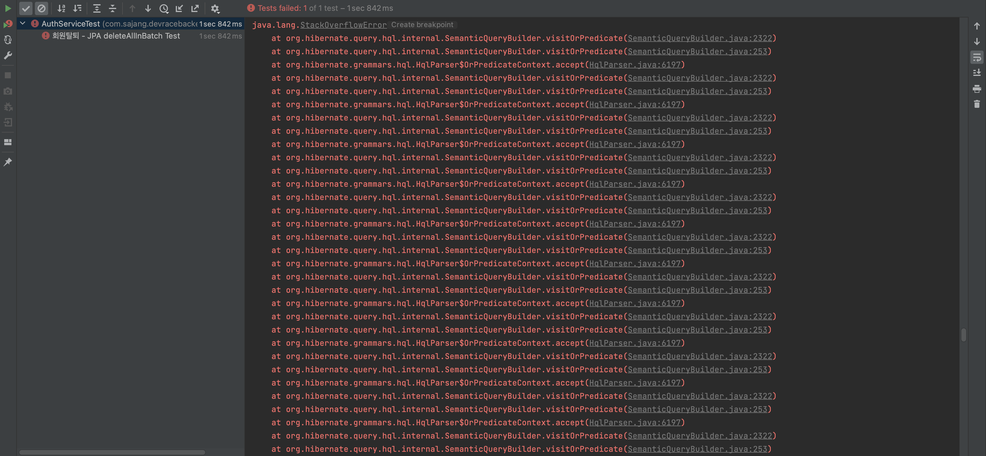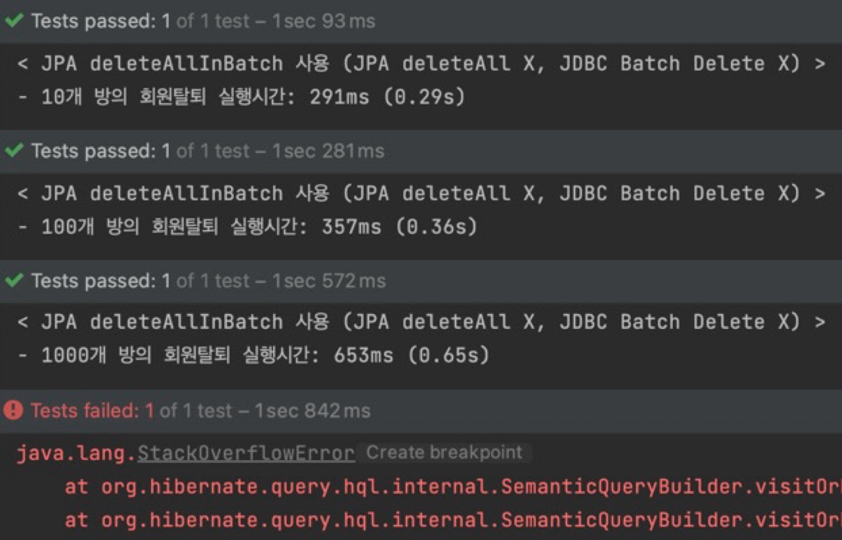 그래서 이번에는 JPA deleteAllInBatch를 대신 호출해보기로 했다.