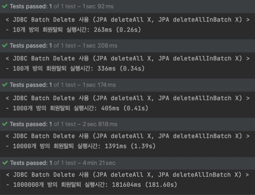 System.out.printf("\n< JDBC Batch Delete 사용 (JPA deleteAll X, JPA deleteAllInBatch X) >\n");