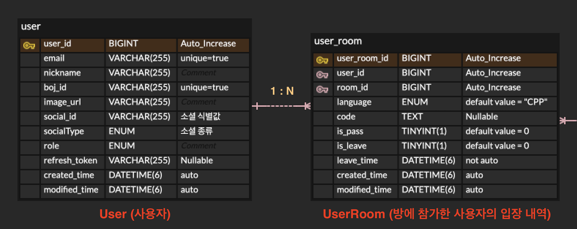 위처럼 엔티티는 User(1) : UserRoom(N) 의 연관 관계로 이루어져있다.