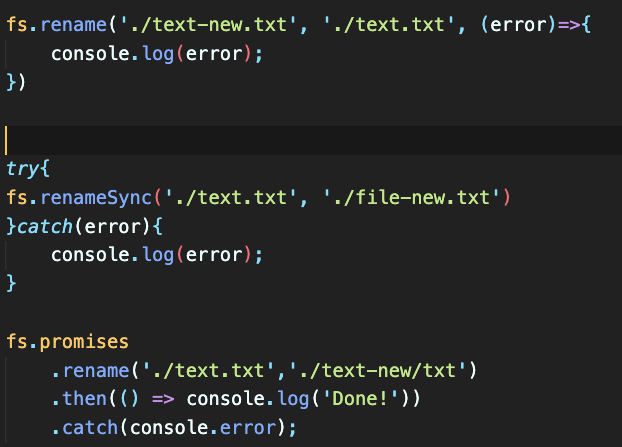 renameSync(...) 블럭킹형태 => 콜백함수 전달 없는형태 에러사항 공지 no : try 와 catch 로 감싸야함 왜냐하면 노드가 중지되니까