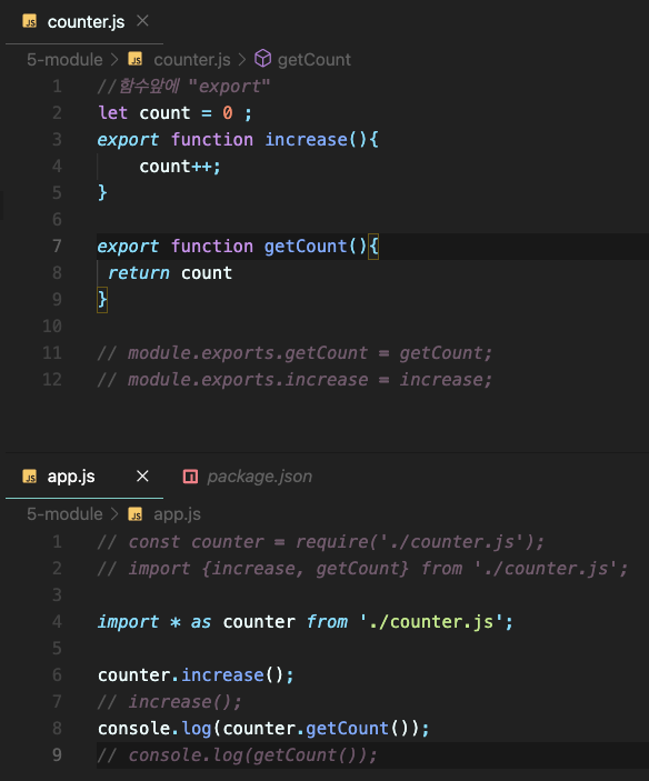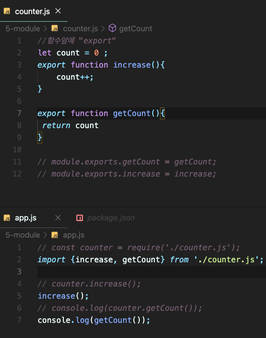 다른모듈에서 쓰려면 1. export 정하고 2. import 명시해야함