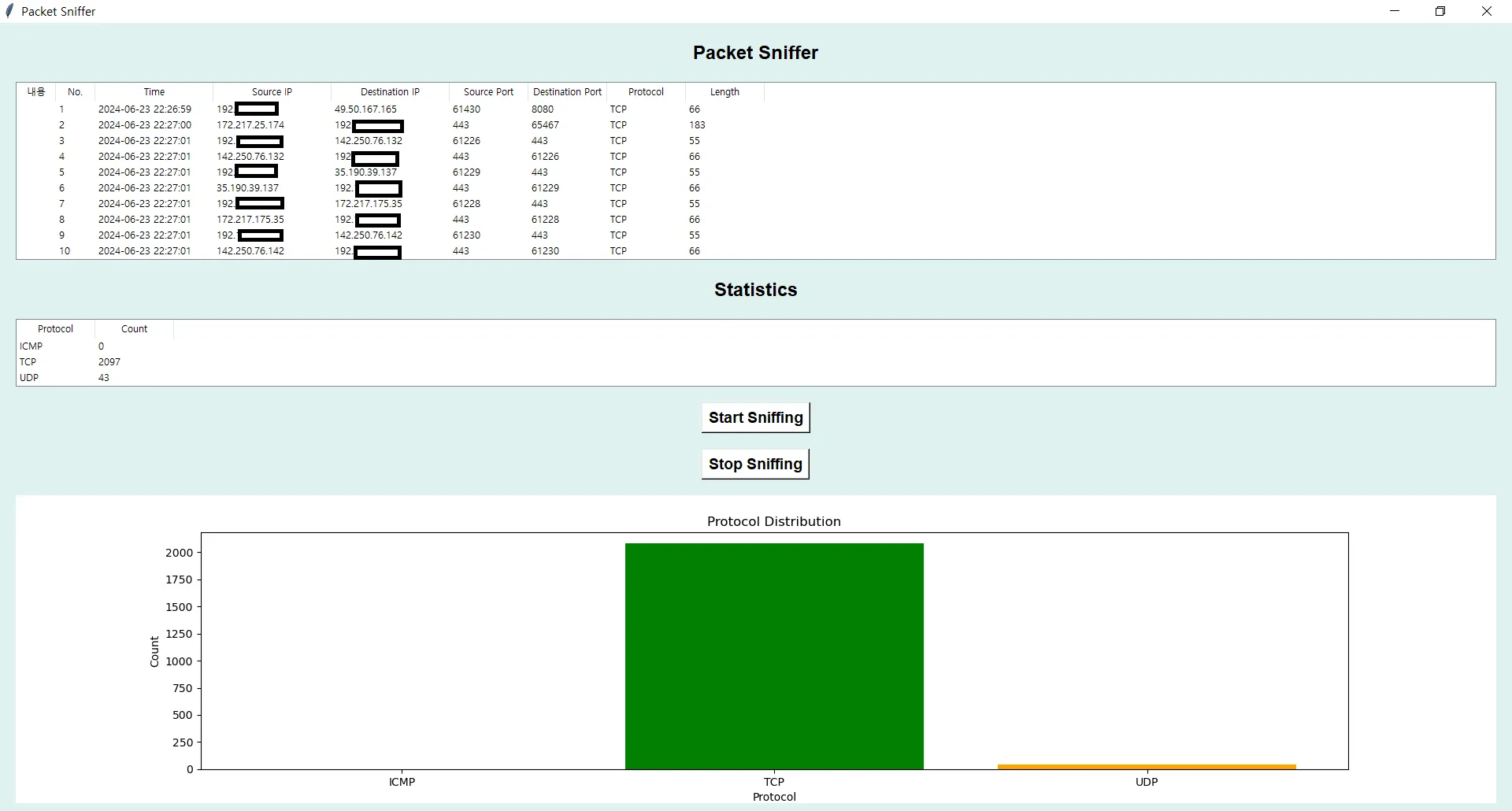 번호,도착 시간,소스 IP,목적지 IP,프로토콜,패킷 길이등을 표 형식으로 GUI에 표시합니다.- 프로토콜 통계: 캡처된 패킷의 프로토콜별 통계를 제공하여, 특정 프로토콜의 패킷 수를 보여줍니다.
