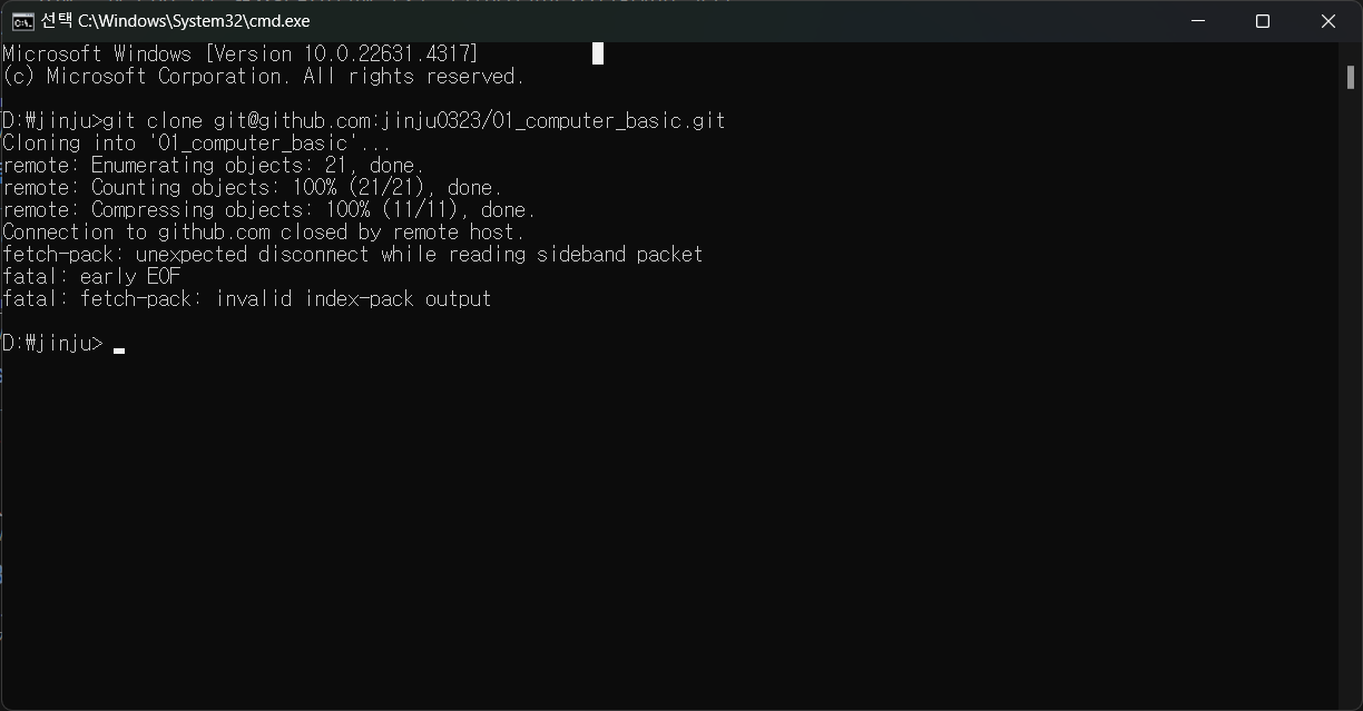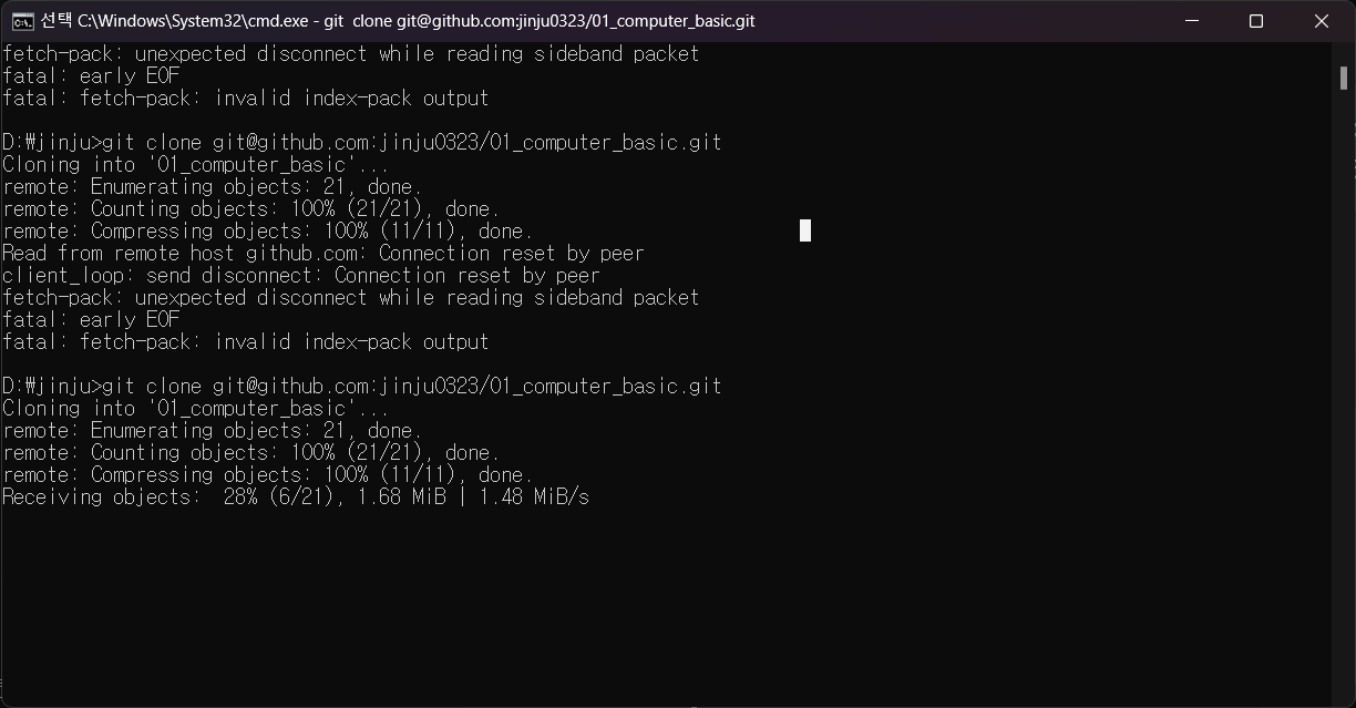 git clone하고 있는 상황에서 멈추는 현상 발생