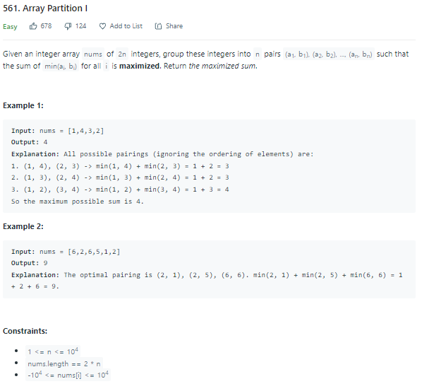 - 주어진 nums를 오름차순으로 정렬 후, 앞에서 부터 2개씩 짝 지어서 계산하면 최댓값임.