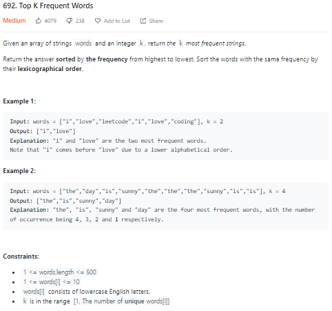 def topKFrequent(self, words: List[str], k: int) -> List[str] :