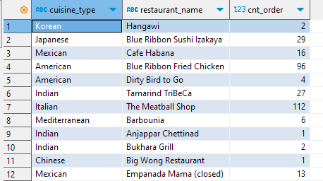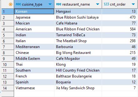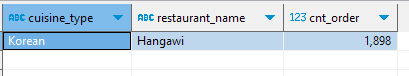 1. 음식타입(cuisine_type), 상점 이름, 그리고 그 두개의 데이터 개수를 알아야 어느 곳이 주문 건수가 가장 많은 곳인지 알 수 있으므로 count(1) cnt_order를 사용해준다.