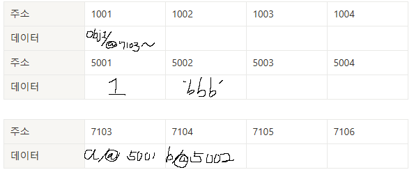 주소 1002번에 식별자와 데이터의 주소값을 넣어주는 방식으로 저장된다.