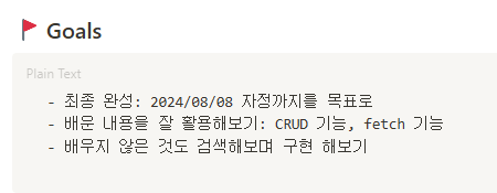 오늘은 08/08까지 진행하게 될 프로젝트에 간단한 틀을 잡아주는 시간을 가졌다. 부족한 부분이 아직 많지만 1주차인만큼 너무 거대한 목표를 잡기보다는 시동을 건다라는 튜터님의 말씀을 잘 듣고 배운것들을 다시 한번 활용해보는 시간을 가져보는 것이 좋을 것 같다.