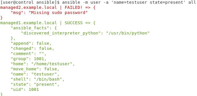$ ansible -m user -a ‘name=testuser state=present’ all