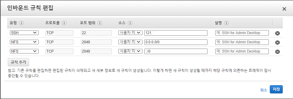 보안그룹 생성 혹은 기존 보안그룹에서 인바운드 규칙 설정