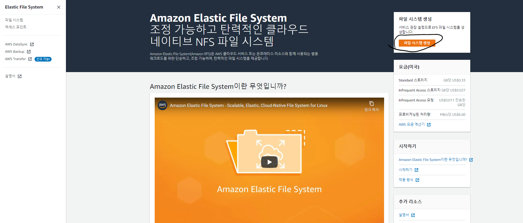 https://ap-northeast-2.console.aws.amazon.com/efs/home?region=ap-northeast-2#/get-started