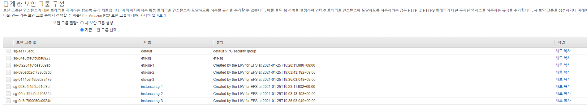 해당 보안 그룹을 기존에 걸정한 보안그룹으로 설정한다.