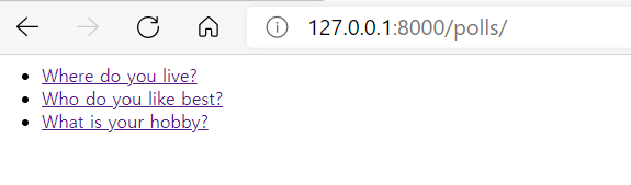그리고 다시 아이피주소/polls로 이동하면 채워넣은 것들을 볼 수 있다.