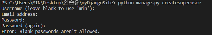 터미널에 python manage.py createsuperuser 를 입력하여 username, password를 생성하면 된다.