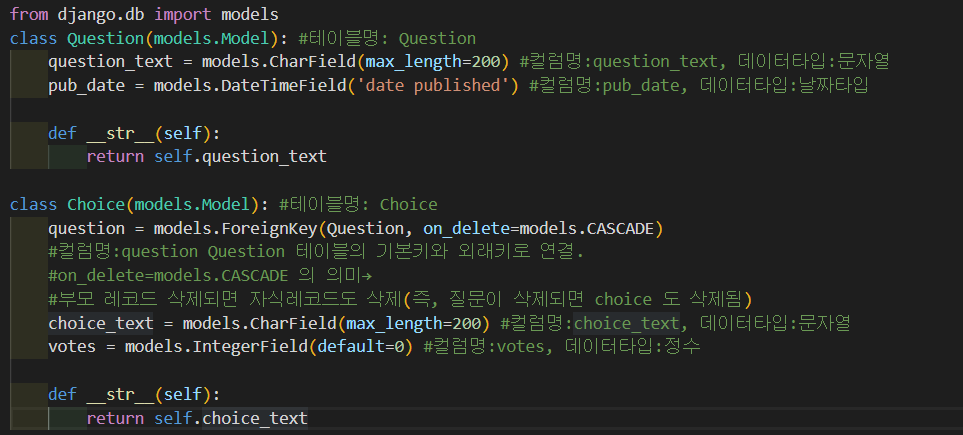 1) 다음과 같이 Question 테이블과 Choice 테이블을 생성하겠습니다.