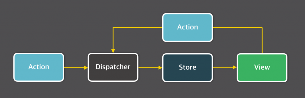 Action이 발생하면 Dispatcher에 의해 변경된 데이터가 Store에 저장되고 해당 데이터를 보여주는 View가 변경되는 흐름이다.