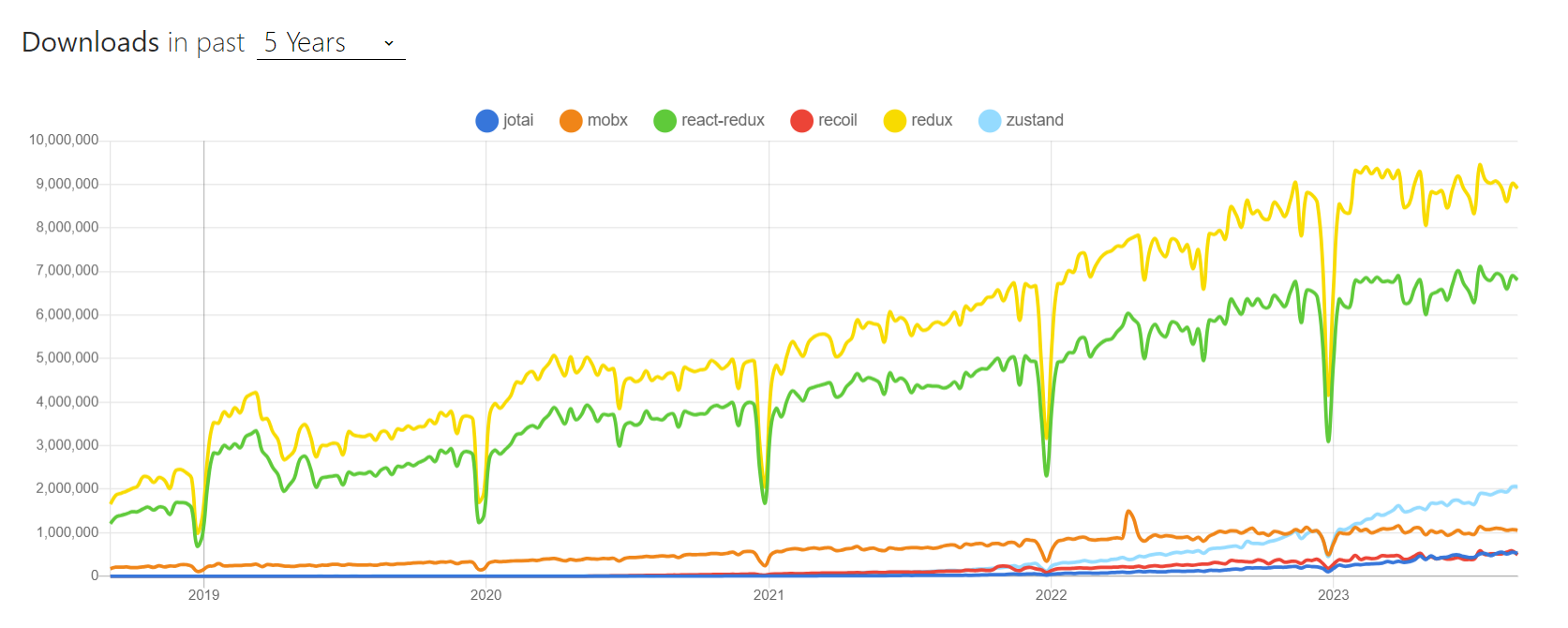그 근거로 npm trends 에서 확인한 최근 5년간 상태관리 라이브러리 다운로드 추세를 비교한 그래프를 가져왔음