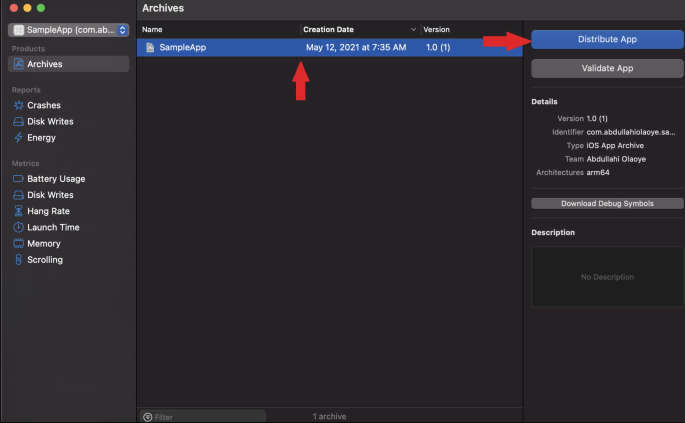 빌드가 완료되었다면 업로드할 앱을 확인하고 Distribute App을 클릭한다.
