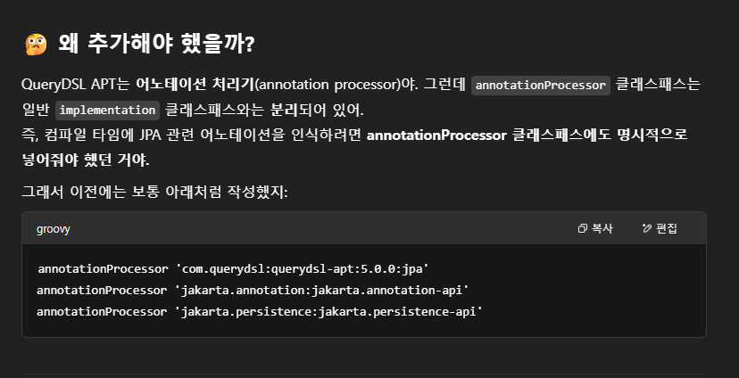 querydsl-apt를 annotationProcessor로 한 이유는 기존 com.querydsl을 사용할 때도 그렇게 주입을 받았기도 하고 블로그 글을 읽어보니 APT 모듈을 위한 플러그인 추가 부분에 AnnotationProcessor 라고 적혀있길래... ㅎ;; 어라? 그럼 그냥 implementation 하지 말고 AnnotationProcessor 를 사용하면 되지 않을까? 하고 해본 것이다.. ㅎ