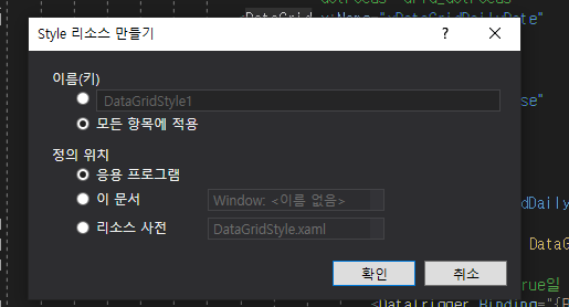원하는 DataGrid 우클릭 -> 템플릿 편집 -> 복사본 편집 -> App.xaml으로 복사된 code 잘라내기 -> StyleFolder 에 있는 작성한 파일에 붙여넣기. 모든 항목 , 응용 프로그램 으로 지정하기