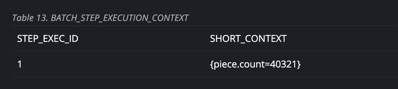 Status, startTime, endTime, executionContext, readCount, writeCount, commitCount, rollbackCount, readSkipCount, processSkipCount, filterCount, writeSkipCount ...