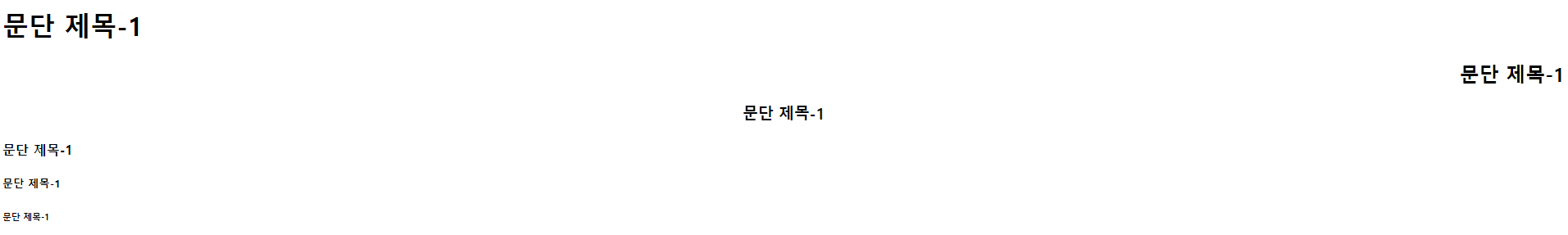 ◈ title 속성 : 툴팁 기능을 이용하여 설명문을 제공하는 속성<h1 align="left" title="문단의 제목을 표현합니다.">문단 제목-1</h1> <h2 align="right">문단 제목-1</h2> <h3 align="center">문단 제목-1</h3> <h4 align="justify">문단 제목-1</h4> <h5>문단 제목-1</h5> <h6>문단 제목-1</h6>