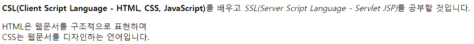 <p><b>CSL(Client Script Language - HTML, CSS, JavaScript)</b>를 배우고 <i>SSL(Server Script Language - Servlet JSP)</i>를 공부할 것입니다.</p> <p>HTML은 웹문서를 구조적으로 표현하며<br>CSS는 웹문서를 디자인하는 언어입니다.</p>
