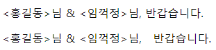→ (공백), &(&), <(<), >(>), "(") 등<p><홍길동>님 & <임꺽정>님, 반갑습니다.</p> <p><홍길동>님 & <임꺽정>님, 반갑습니다.</p>