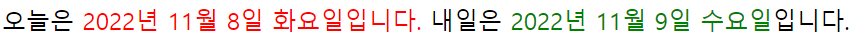 <div style="font-size: 24px">오늘은 <span style="color: red">2022년 11월 8일 화요일입니다.</span> 내일은 <span style="color: green;">2022년 11월 9일 수요일</span>입니다.</div>