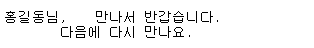 <pre>홍길동님, 만나서 반갑습니다. 다음에 다시 만나요.</pre>