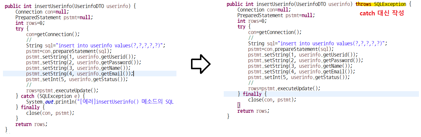※ 기존 DAO에서 catch 제거 (throws를 써서 에러 떠넘기기)