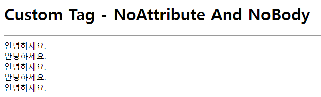 <%@ page language="java" contentType="text/html; charset=UTF-8" pageEncoding="UTF-8"%> <%-- taglib 디렉티브를 사용하여 TLD 파일을 제공받아야 JSP 문서에서 커스텀 태그를 사용 가능 --%> <%@taglib prefix="simple" uri="http://www.itwill.xyz/mvc/custom" %> <!DOCTYPE html> <html> <head> <meta charset="UTF-8"> <title>MVC</title> </head> <body> <h1>Custom Tag - NoAttribute And NoBody</h1> <hr> <%-- 태그 내용이 있는 경우 시작태그와 종료태그를 따로 작성 --%> <%-- <simple:hello></simple:hello> --%> <%-- 태그 내용이 없는 경우 시작태그와 종료태그를 같이 작성 --%> <simple:hello/> <simple:hello/> <simple:hello/> <simple:hello/> <simple:hello/> </body> </html>