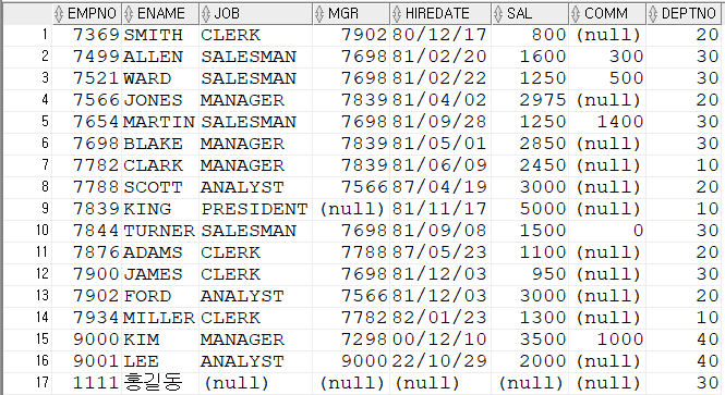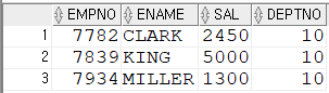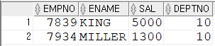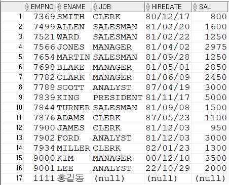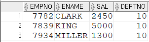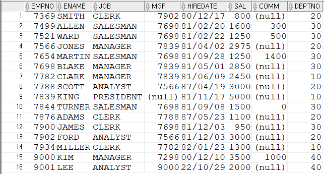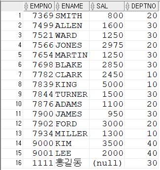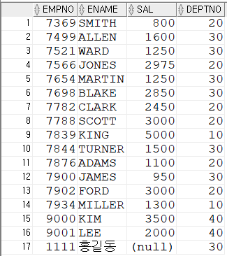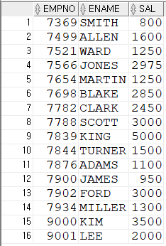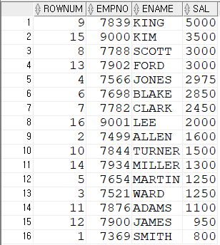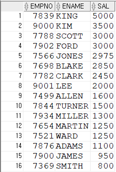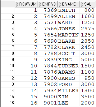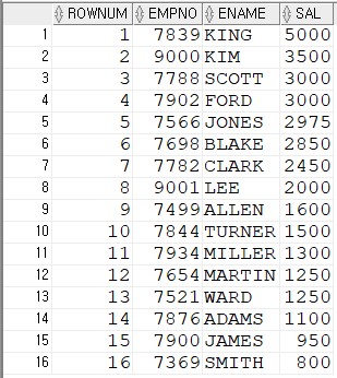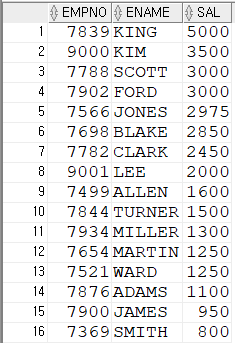 설정하여 조건식에 사용해 검색 가능SELECT * FROM (SELECT ROWNUM RN,TEMP.* FROM (SELECT EMPNO,ENAME,SAL FROM EMP ORDER BY SAL DESC) TEMP) WHERE RN=10;