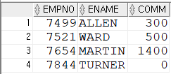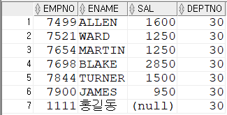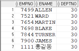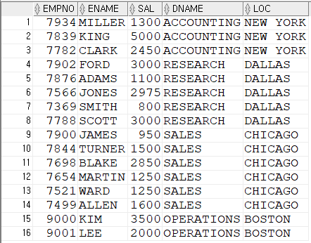 행을 서로 결합하여 검색SELECT EMPNO,ENAME,SAL,DNAME,LOC FROM EMP JOIN DEPT ON EMP.DEPTNO=DEPT.DEPTNO;