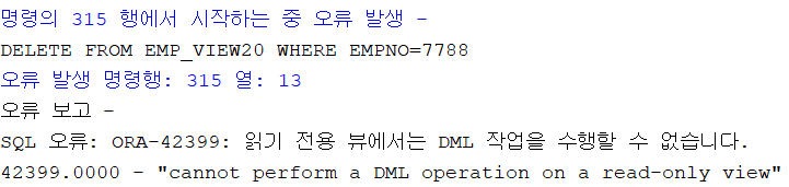컬럼값을 변경할 경우 에러 발생UPDATE EMP_VIEW10 SET DEPTNO=20 WHERE EMPNO=7782;