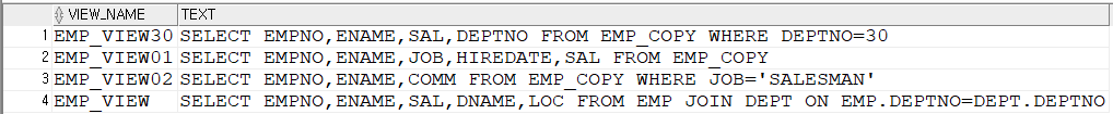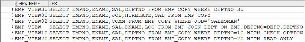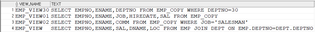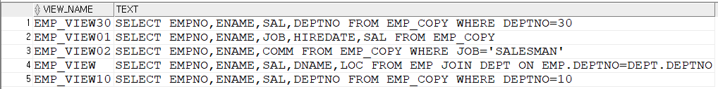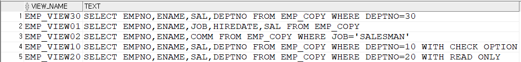 CREATE VIEW EMP_VIEW01 AS SELECT EMPNO,ENAME,JOB,HIREDATE,SAL FROM EMP_COPY;