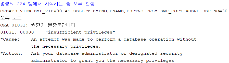 ◈ 현재 접속 사용자는 뷰에 대한 시스템 권한이 없으므로 뷰를 생성할 경우 에러 발생 - 관리자에게 뷰에 대한 시스템 권한 요청