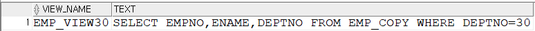 CREATE VIEW EMP_VIEW30 AS SELECT EMPNO,ENAME,DEPTNO FROM EMP_COPY WHERE DEPTNO=30;