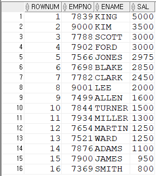 📘EMP 테이블에 저장된 모든 사원의 사원번호,사원이름,급여를 급여로 내림차순 정렬하여 행번호를 제공받아 검색