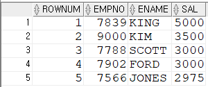 SELECT ROWNUM,TEMP.* FROM (SELECT EMPNO,ENAME,SAL FROM EMP ORDER BY SAL DESC) TEMP WHERE ROWNUM<=5;