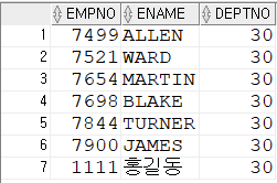 INSERT INTO EMP_VIEW30 VALUES(1111,'홍길동',30);