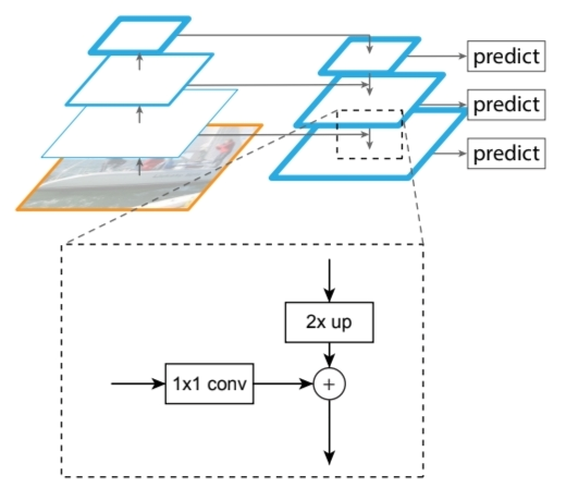 위 그림의 점선으로 된 박스를 통해 Buttom up pathway 의 feature map이 Top-down pathway의 feature map와 lateral connection을 통해 합쳐짐을 알 수 있습니다. Buttom up은 input image를 2배씩 down scale하면서 feature map을 생성했고, Top-down은 Buttom up 과정에서 생성된 feature map 중 가장 작은 feature map(논문에선 coarsest resolution map으로 지칭) 부터 2배씩 upscaling하는 과정을 통해 feature map을 생성했기 때문에 동일한 scale의 feature map 끼리는 merge가 가능했습니다. 이 과정을 통해 semantic함과 다양한 resolution의 local한 정보를 잘 학습할 수 있다고 합니다.