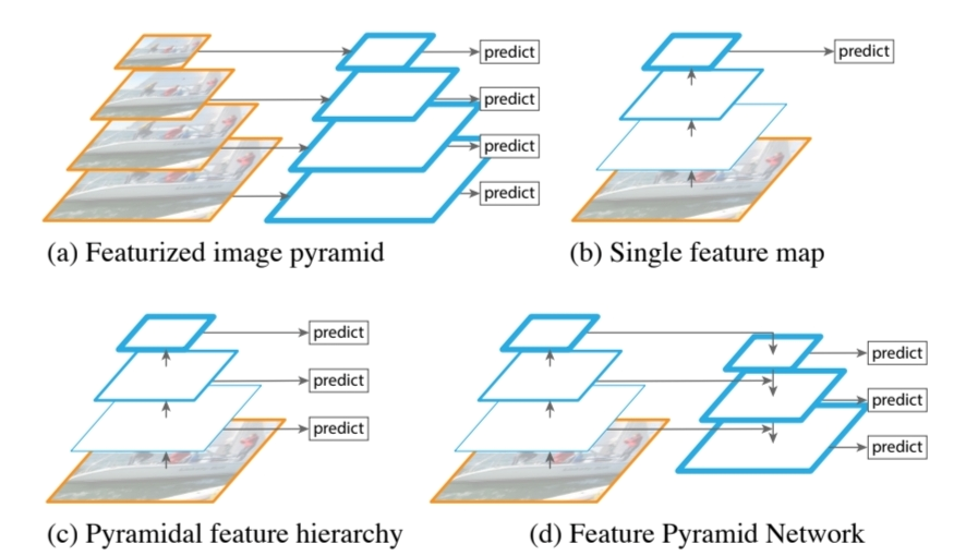 논문에서는 위와 같은 그림을 통해 지금까지 제안되어 왔던 Feature Pyramid를 활용한 모델들을 소개합니다. 그러나 이 모델들은 속도가 느리거나 다양한 scale의 object detection에는 불리한 점들이 있었습니다. 따라서 본 논문에서는 다양한 scale의 object에 대해서 정확히 식별하는 것을 목표로 하는 Pyramid Network를 제안하고자 합니다.