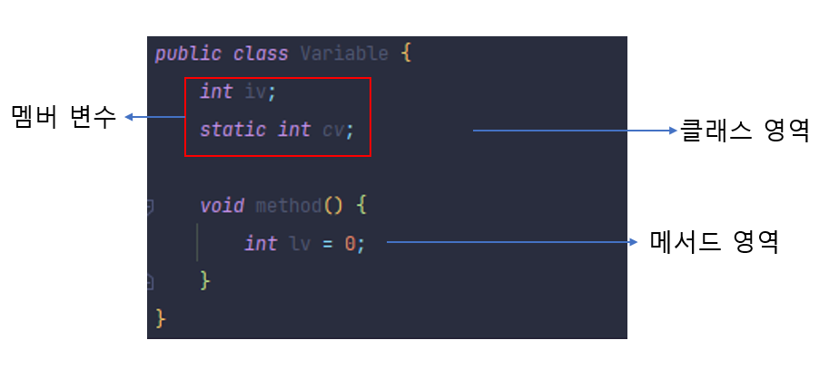 - 인스턴스 변수와 클래스 변수를 멤버 변수가 속해있음.