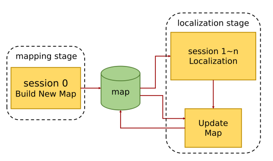 초기 맵핑 단계에서는 새로운 환경에서 로봇이 LiDAR,IMU, 휠 인코더 등의 센서 데이터를 수집하여 환경을 표현하는 맵을 생성합니다. 맵은 여러 Occupancy grid submap으로 구성되어 있고 각 서브맵은 고정된 개수의 LiDAR 스캔과 해당 스캔의 위치를 포함합니다.
